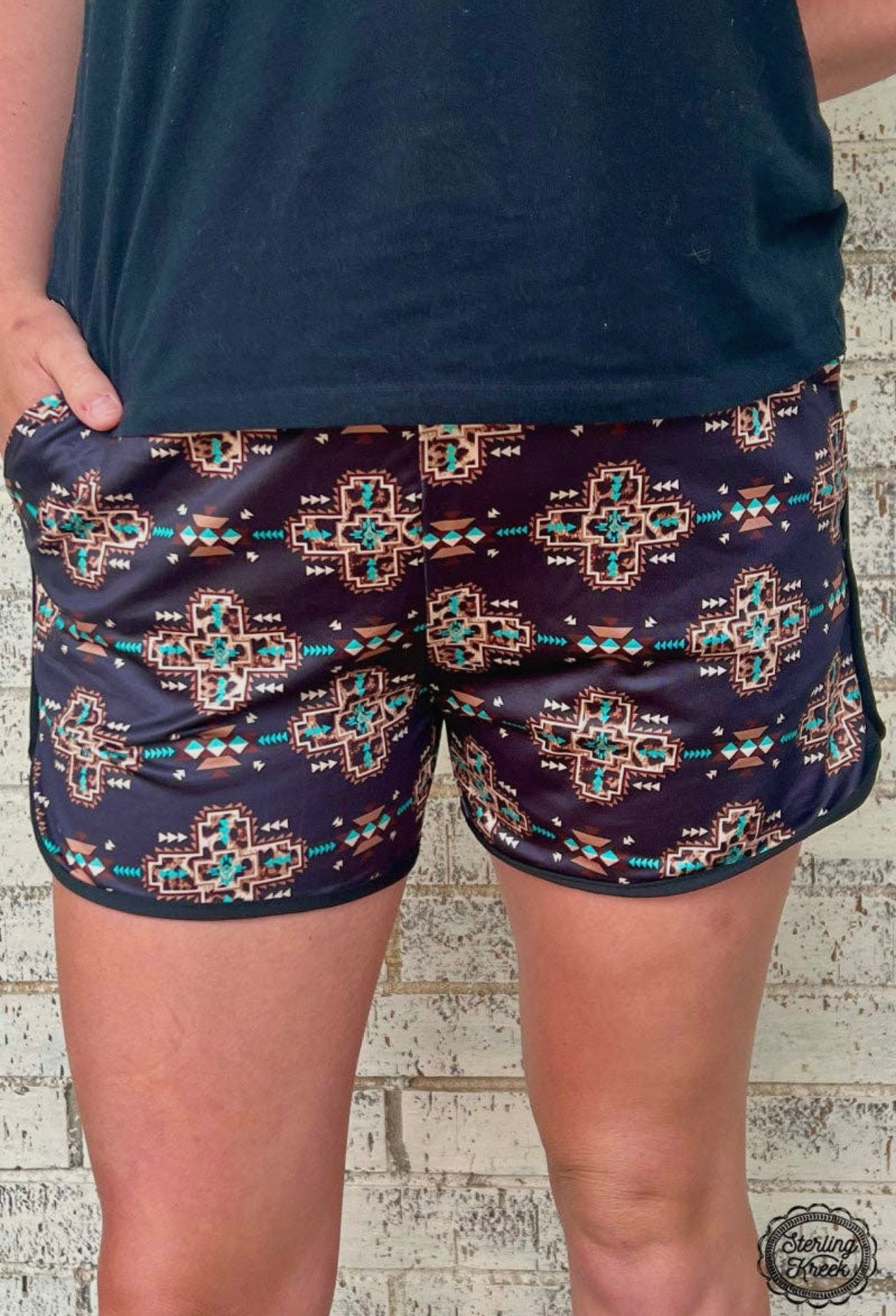 Black aztec with leopard print cross pattern. Has pockets and adjustable string in the waistband.